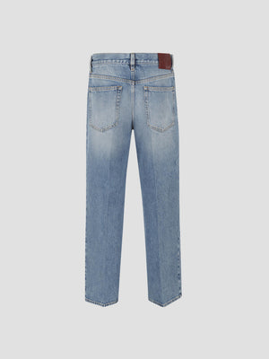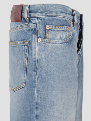 A timeless light blue stonewashed certified cotton denim, Gucci Rosso Ancora naplak label, belt loops five-pocket style, front crease, button and zip fly closure, and straight fit. Made from 100% cotton.