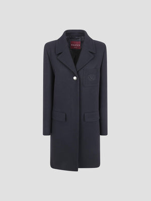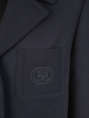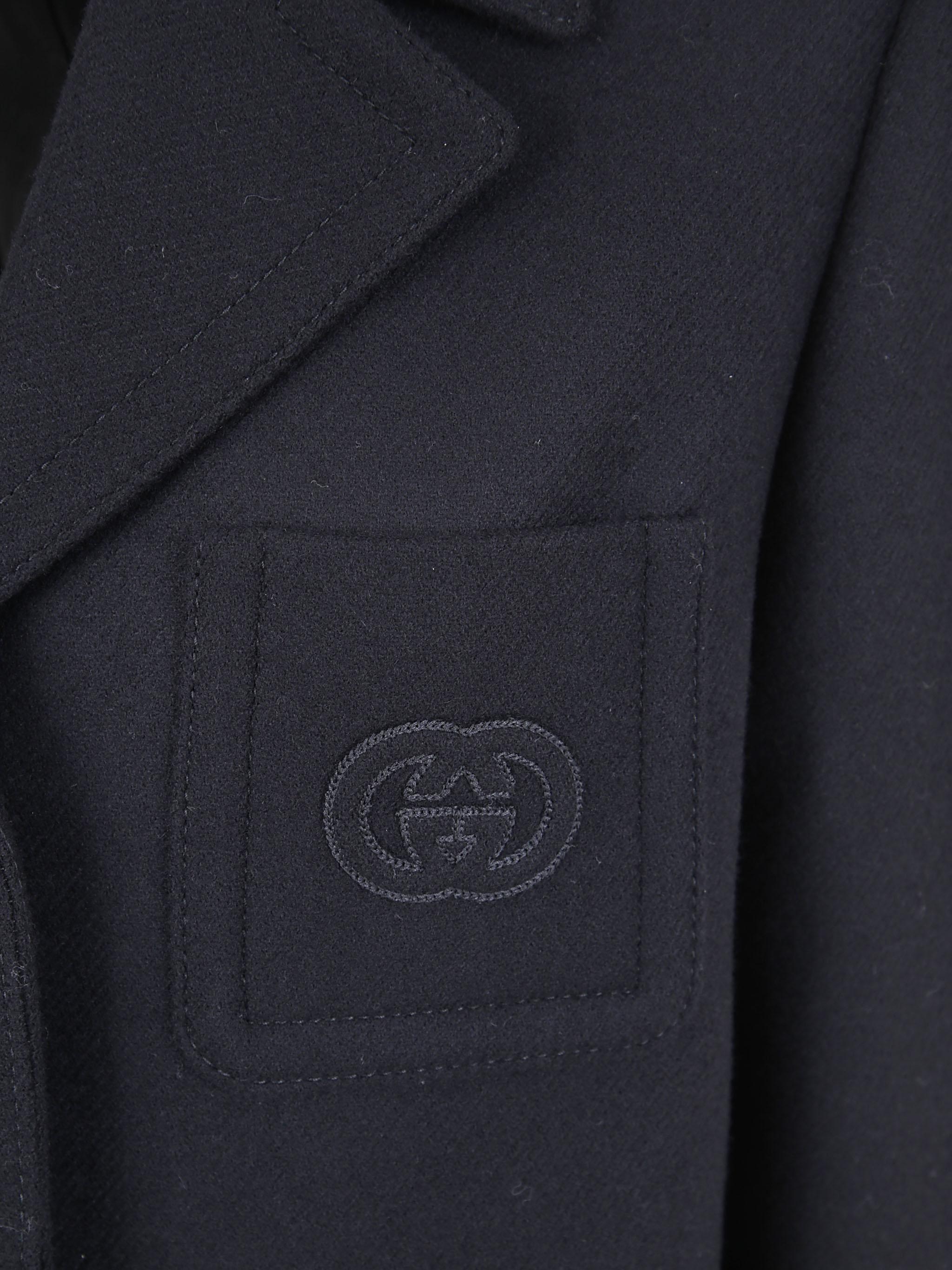 This batavia wool coat is crafted from black wool with a structured, longline silhouette. It is defined by a peak lapel, double-breasted button closure, and an archival gucci heritage patch on the sleeve. Featuring front flap pockets and a back vent.