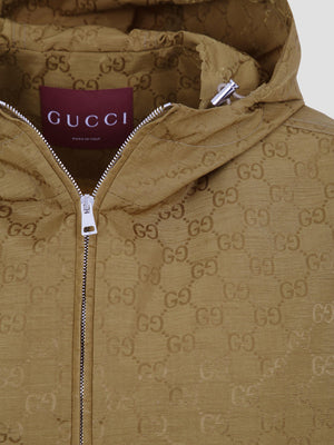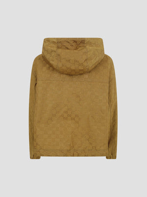 This technical jacquard jacket is crafted from caramel fabric with an all-over GG pattern. It is defined by a fixed hood, a loose fit, and a front zip closure. Featuring long sleeves with elasticated cuffs, slanted inset side pockets, and a straight hem.