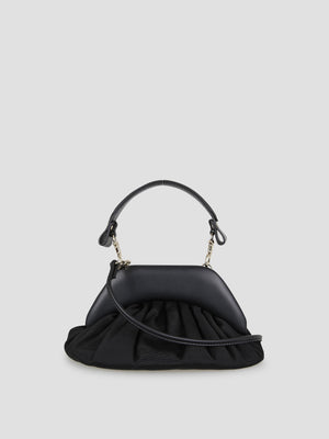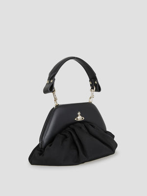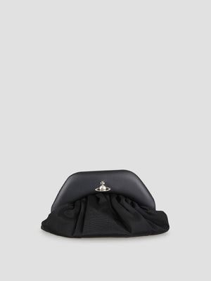 The broke clutch is crafted from fluid, draped viscose, its soft, flared silhouette and ruched detailing evoke a classic mid-century aesthetic. The bag is defined by the iconic metallic Orb logo on the front and features a practical magnetic closure.