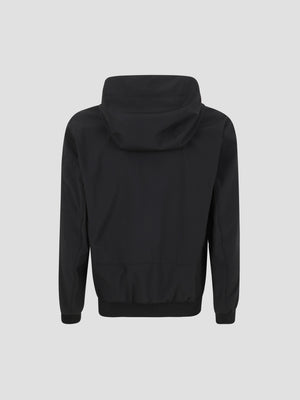 The Shell-R Hooded Lens Jacket is a technical soft-shell essential crafted from recycled, weather-resistant fabric. This straight-cut jacket features a high collar with an integrated hood, a full-zip closure, and the iconic Lens detail on the zipped sleeve pocket. Secure front zipped pockets and a buttoned internal compartment.