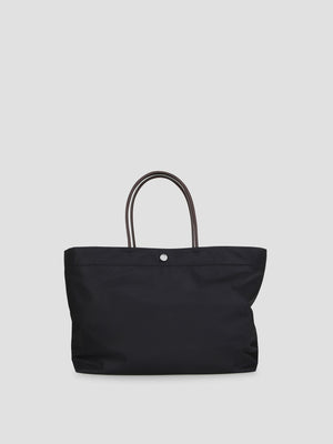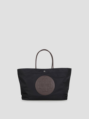 Shoulder bag in durable nylon featuring a maxi front logo patch and a twisted handle design. It includes a secure snap closure and an interior zip pocket.