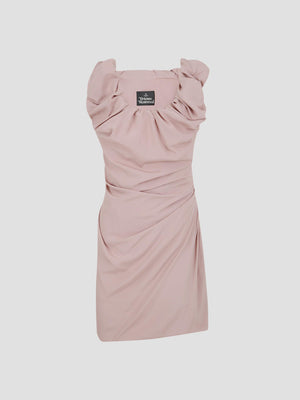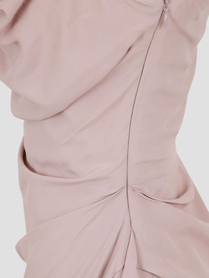 This silk draped mini dress features an off-the-shoulder square neckline with fluid draping and an internal corset for a structured, cinched fit. The soft silk fabric is artfully gathered at the hips to create a distorted silhouette.