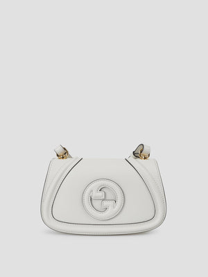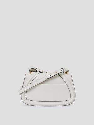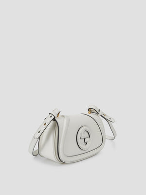 An elevated staple with white leather trim, brown cotton linen lining, round Interlocking G, 1 open pocket inside, 1 back open pocket on the outside and an adjustable leather shoulder strap with 20' - 21.2' drop and length of 40.1' - 42.5', and magnetic closure.