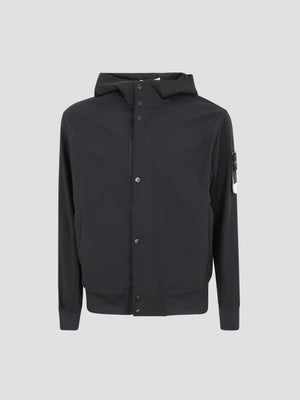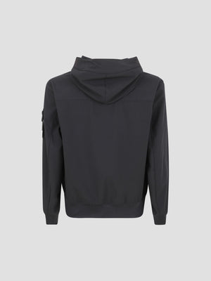 Water and wind-resistant jacket made from a 3-layer performance material using sustainable e.dye® technology. It features a drawstring hood, concealed-zip pockets, ribbed trims, and the signature sleeve badge.