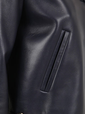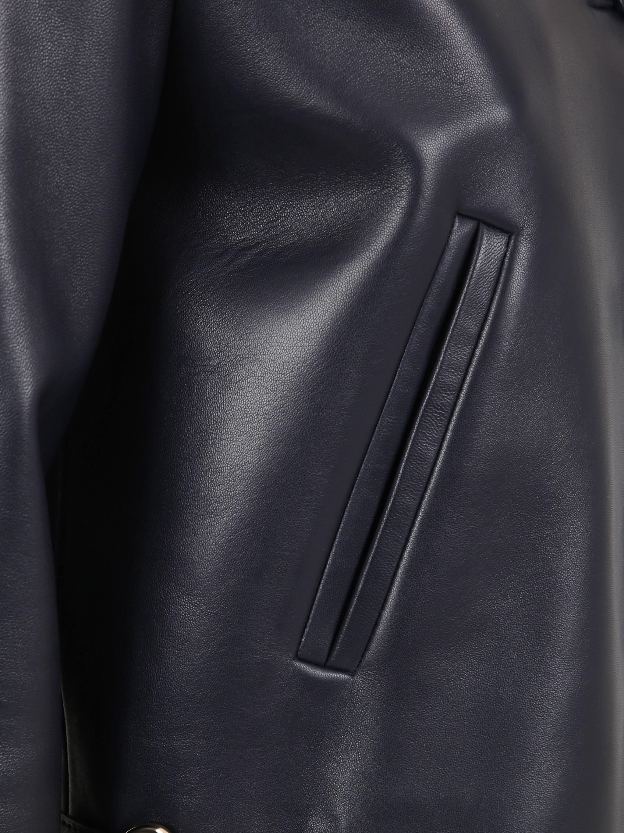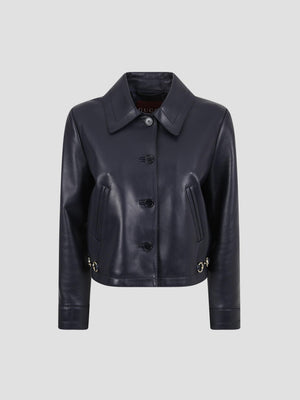 This shiny leather jacket is crafted from dark blue lambskin with a polished, structured finish. It is defined by the house's archival gold-toned horsebit hardware on the front pockets, a pointed collar, and long sleeves.