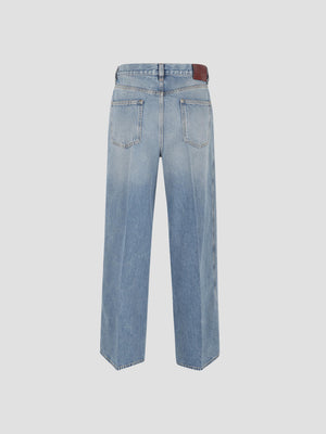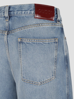 Wide-leg jeans by Gucci in light blue cotton denim with a faded effect, featuring a front zip and button fastening, belt loops, five classic pockets and a Ancora GUCCI coloured back patch with embossed lettering logo. Made from 100% cotton.