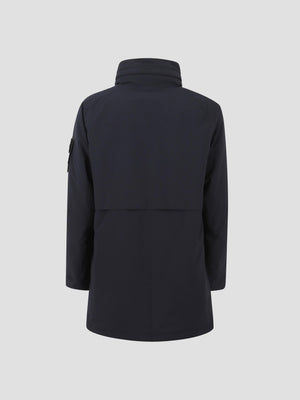 Precision finishing and tonal accents reflect a focus on longevity and restraint technical fabric approach with a double slider zip under placket with snaps, rigid collar with concealed zip hood; hood with all-round drawstring and mesh lining, raglan sleeves; logo patch on the left sleeve, elbow gussets; Adjustable snap cuffs; Mid-back vents with mesh lining, this piece is crafted from 92%polyester 8%elastane for a clean, elegant drape technical fabric approach.