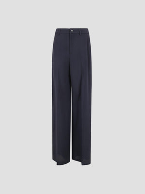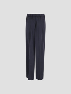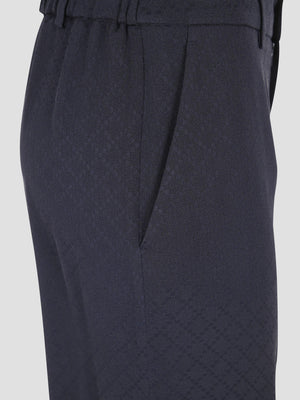 These trousers are crafted from a dark blue silk-blend jacquard featuring an intricate diamond motif. The unlined design offers a lightweight feel, complemented by belt loops, a classic zip and logo-button closure, and two side welt pockets.