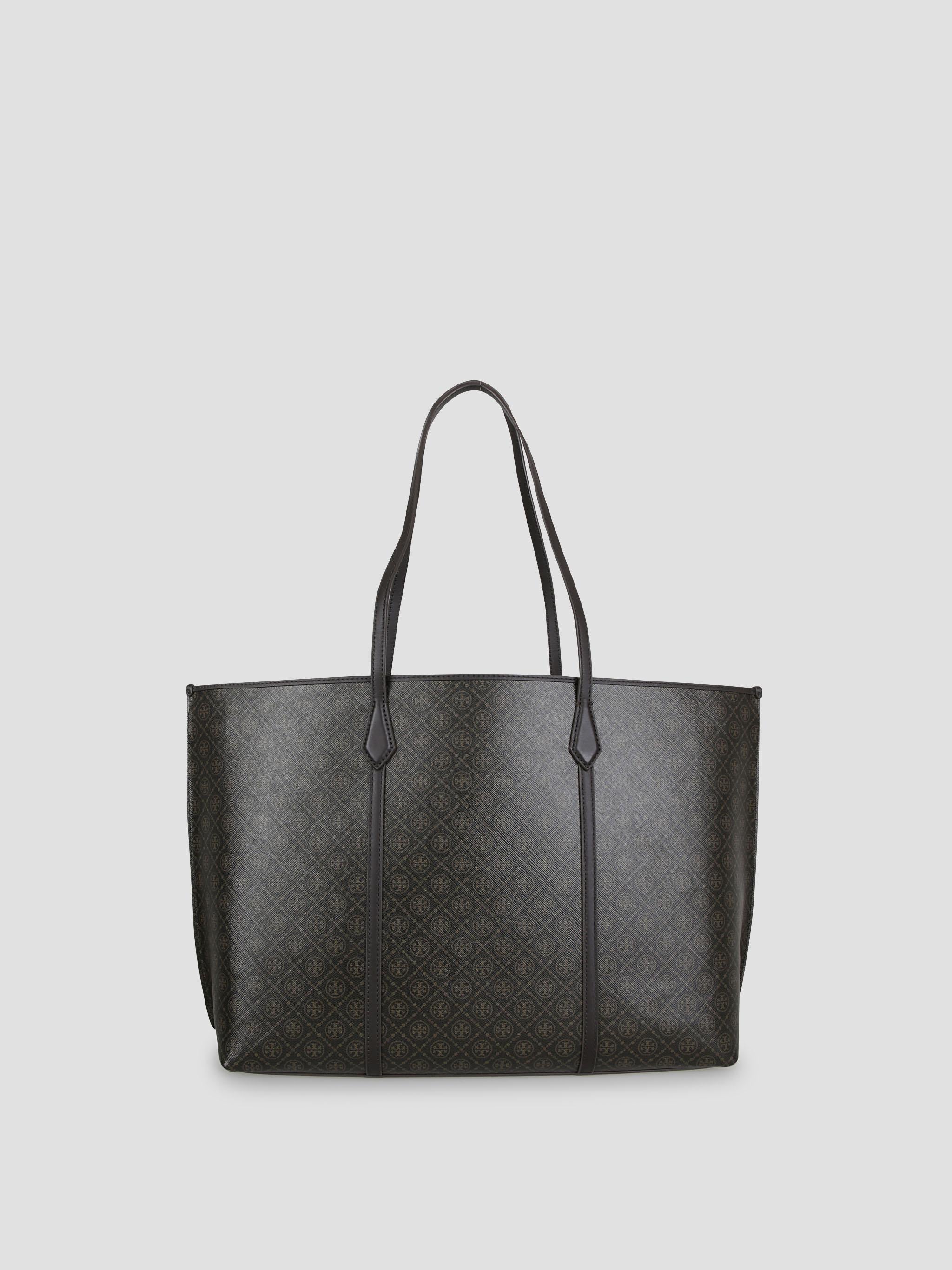 Tote bag featuring the signature T monogram pattern in a matte coated finish with leather trim. It is designed with a spacious interior that includes a hanging zip pocket.