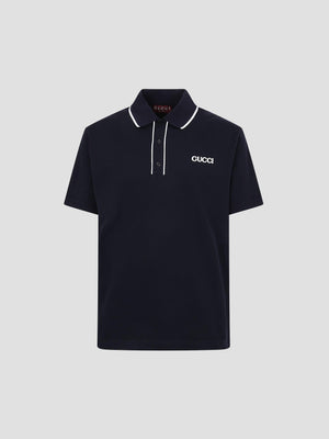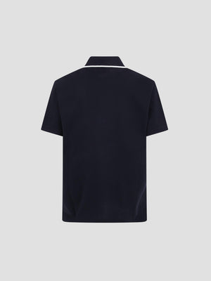 This navy blue stretch cotton piqué polo features modern drop shoulders and short sleeves. Designed with a classic polo collar and button front closure, it is accented by white contrast trim on the ribbed cuffs and collar, finished with a signature logo embroidery detail.