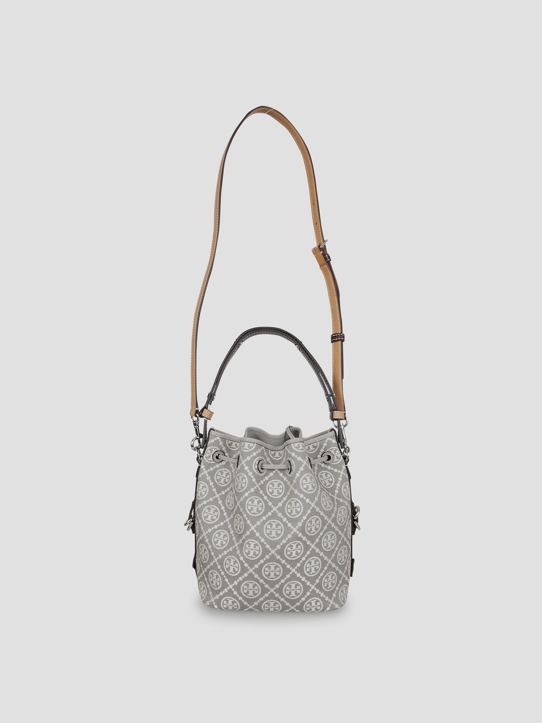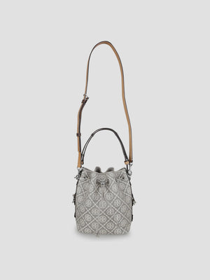 Bucket bag crafted in signature woven jacquard with leather trim and sporty webbing details. It features a drawstring closure with a logo cord stopper, two exterior side pockets and a removable crossbody strap.