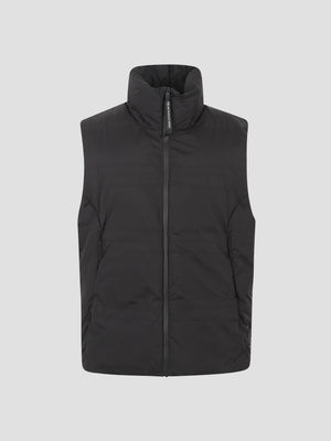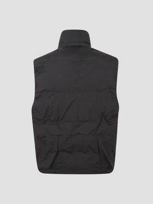 Quilted sleeveless vest with water-repellent goose down padding, adjustable retractable hood, standing collar, front zip closure, pockets, drawstring at the hem, foldable. Made from 100% polyamide.
