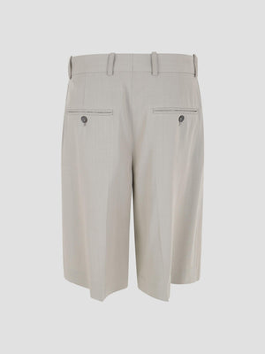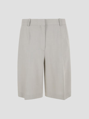 Viscose knee-length shorts defined by their tailored silhouette and fluid drape. Crafted from viscose with a subtle sheen, they feature a structured wide hem, tilted side pockets, and elegant jet back pockets.