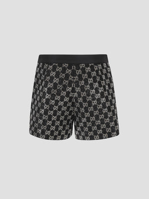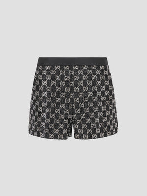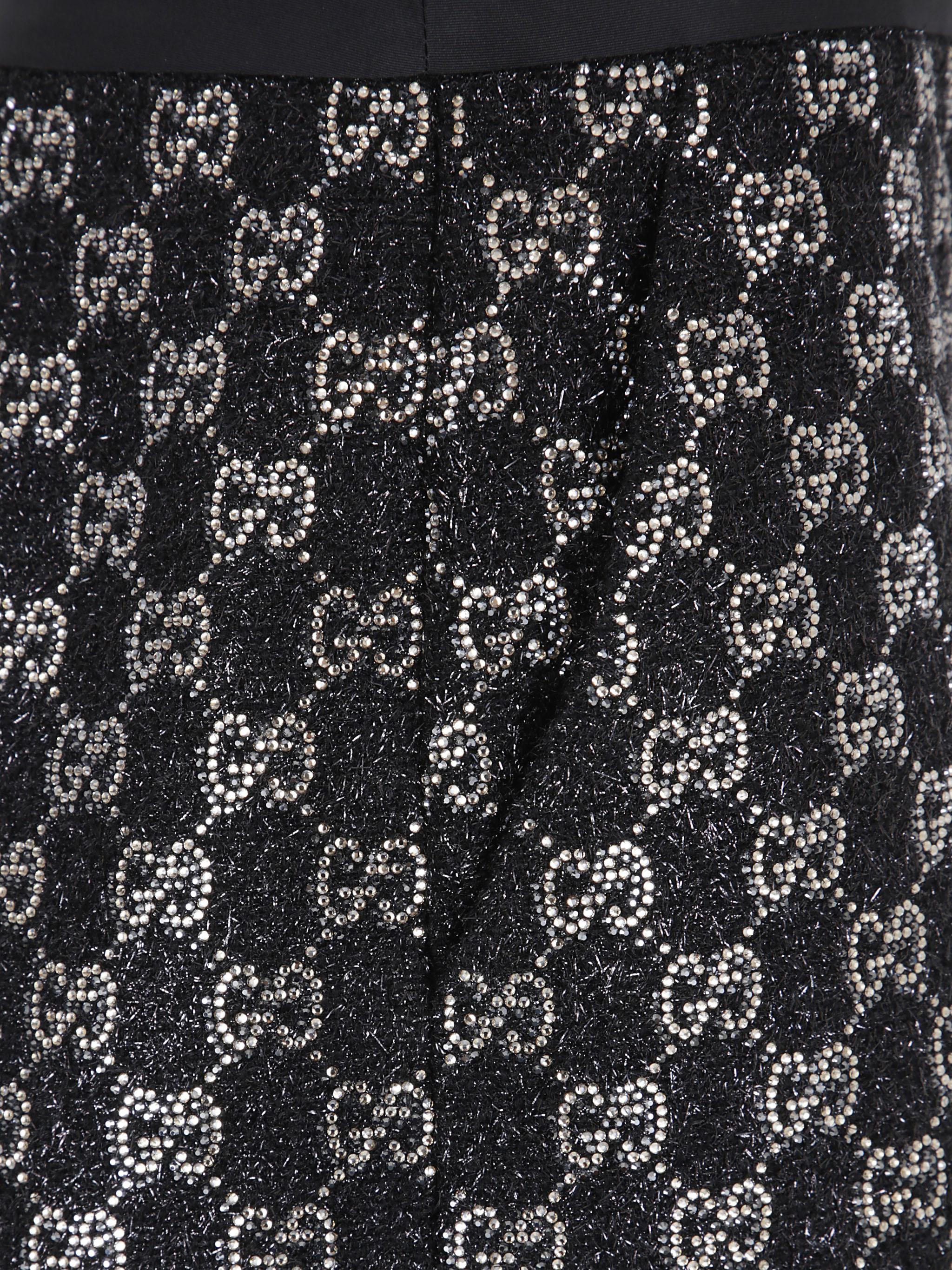 These shorts are crafted from lightweight black lamé wool tweed with a shimmering finish. They are defined by an all-over GG crystal embroidery, two side pockets, and a fully lined interior for a smooth fit.