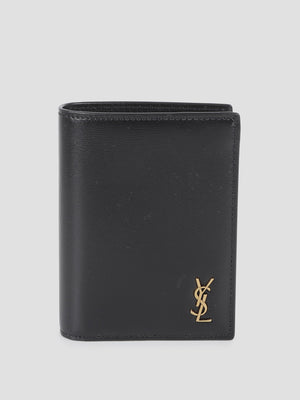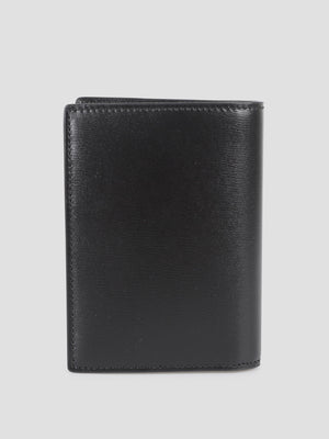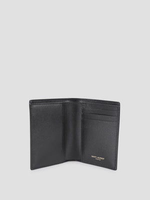 Tailored as a refined piece, 100% calf leather with bronze-colored metal parts. Dimensions: 8 x 11 x 2 cm Interior: Four card slots, two receipt compartments, one bill compartment.